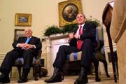 Первая встреча Джорджа Буша и Ариэля Шарона, длившаяся всего 45 минут, состоялась в среду вечером за закрытыми дверями. На совместной пресс-конференции, состоявшейся по окончании переговоров, Буш назвал Шарона "близким другом" и рассказал, что Шарон пообещал перевести оставшиеся миллиарды руководству ПА, а также "заботиться об улучшении экономического положения арабов".