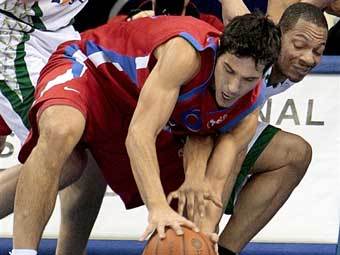 ЦСКА - "Жальгирис". Никос Зисис (на переднем плане) против Маркуса Брауна. Фото AFP