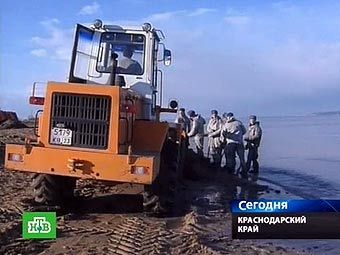 Сбор мазута на берегу Керченского пролива. Кадр телеканала НТВ, архив