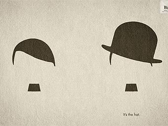 Рядом помещено точно такое же изображение головы, но уже котелке, который изящным способом преображает Гитлера в Чарли Чаплина. Подпись на плакате гласит: "Это шляпа".