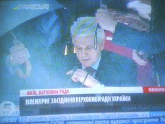 Сообщается, что Литвина прикрыли от яиц зонтиками стоявшие рядом с ним депутаты Партии регионов. Задымление в зале вынудило многих политиков покинуть заседание, на котором первоначально зарегистрировались 211 парламентариев. Тем не менее, Литвин продолжает вести заседание. По данным РИА Новости, спустя некоторое время один из оппозиционеров бросил в зал вторую дымовую шашку.