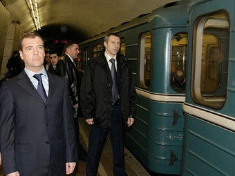Медведев спустился на станцию "Охотный ряд" Московского метрополитена 27 января. Его сопровождали глава МЧС Сергей Шойгу, министр внутренних дел Рашид Нургалиев, директор ФСБ Александр Бортников, мэр Москвы Сергей Собянин и глава Минтранса Игорь Левитин.