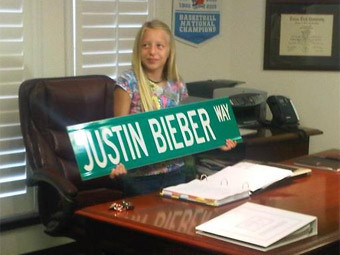 Первым решением девочки в статусе мэра стало именно переименование части Главной улицы в Проезд Джастина Бибера. Изготовление уличного указателя с именем Бибера обошлось городской казне примерно в 20 долларов, указывает NY Daily News. Знак разрешили оставить на улице на сутки.
