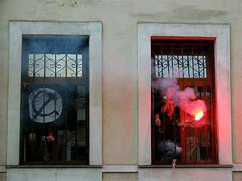 Нацболы провели акцию в МИДе 2 июля 2008 года. Они проникли в служебное помещение, приковали себя наручниками к окнам, зажгли дымовые шашки и выкрикивали лозунги.
