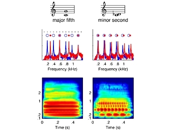 Чистая квинта и малая секунда - спектры консонантного и диссонантного интервалов. Изображение M. Cousineau et al., PNAS Early Edition (2012)