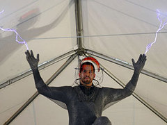 Американский иллюзионист Дэвид Блейн задумал новый фокус - он намерен провести три дня и три ночи под воздействием электрического тока. По словам самого 39-летнего фокусника, напряжение составит один миллион вольт. Посмотреть на Блейна под током можно будет в Нью-Йорке. Старт шоу запланирован на пятницу, 5 октября. | Двум обжорам навсегда закрыли вход в ресторан