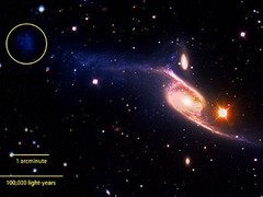 Астрономы обнаружили, что крупная спиральная галактика NGC 6872 в созвездии Павлина на самом деле гораздо больше, чем считалось ранее, и является крупнейшей среди спиральных галактик. Открытие удалось совершить благодаря наблюдениям в ультрафиолетовой области, проведенным ортбитальным телескопом "GALEX". |