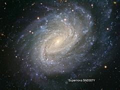 Астрономы Южной Европейской обсерватории опубликовали самое подробное из существующих изображение спиральной галактики NGC 1187. На нем можно рассмотреть выраженную спиральную структуру галактики, ее молодые периферические и старые центральные области. Также, видно обнаруженную в 2007 году пока еще яркую сверхновую. |