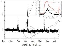 Астрономы вычислили массу черной дыры по излучению остатков поглощенной звезды. Объект был обнаружен в 2011 году благодаря мощнейшей из когда-либо зафиксированных астрономами вспышке гамма-излучения. Ее периодичность, которая отражала скорость вращения аккреционного диска, позволила установить массу объекта. |