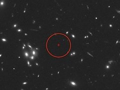 Гравитационная линза помогла астрономам взглянуть на крайне удаленную от Земли галактику MACS1149-JD1. Если обнаружение галактики подтвердится, то она станет самой удаленной из известных на настоящий момент - ее красное смещение составляет 9,6, то есть свет от нее добирался до Земли 13 миллиардов лет. |