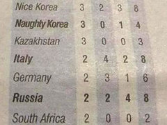 Новостное агентство Северной Кореи KCNA обвинило австралийскую газету mX в травле КНДР, некомпетентности, глупости и деградации. Таким образом в КНДР отреагировали на статью в газете, в которой олимпийскую сборную страны назвали Naughty Korea ("Порочная Корея"). Южную Корею mX назвала Nice Korea ("Милая Корея"). |