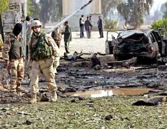Американские и иракские солдаты охраняют место взрыва бомбы у въезда в "зеленую зону" в центре Багдада. Фото Reuters, 14 декабря 2004 года