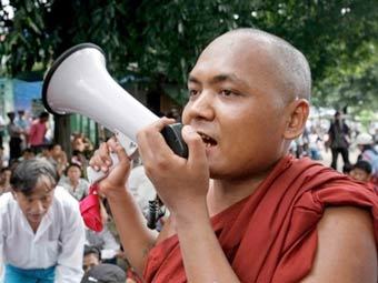 Буддийский монах на демонстрации в Мьянме. Фото AFP