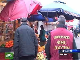 Сотрудники ФМС с проверкой на рынке. Кадр телекомпании НТВ