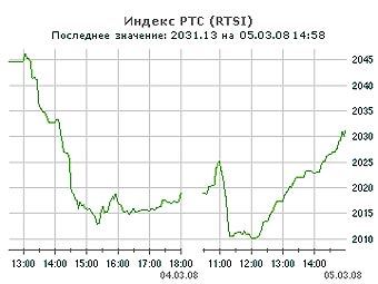 Российские фондовые индексы РТС и ММВБ на торгах 5 марта начали восстанавливаться после четырехдневного падения. РТС к 15:00 по московскому времени вырос на 0,61 процента до 2031,13 пункта, а ММВБ - на 0,92 процента до 1651,28 процента.