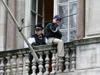 Активист "Sea Shepherd" на балконе посольства Японии в Лондоне. Фото AFP