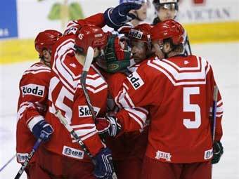 Хоккеисты сборной России после четвертой шайбы в ворота итальянцев. Фото AFP