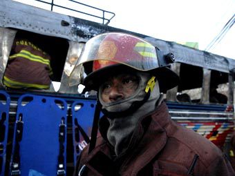 Пожарный у взорванного автобуса. Фото ©AFP
