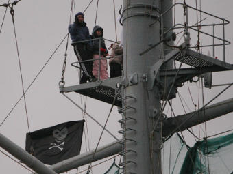 Напомним, что вечером 16 октября трое человек, среди которых была одна девушка, забрались на мачту "Авроры" и подняли пиратский флаг. Специалисты пытались спустить молодых людей с мачты около трех часов. Девушку удалось уговорить спуститься.