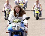 Тридцатидвухлетняя Анна Рамсден из графства Йоркшир - невеста полупрофессинального спортсмена-байкера Кевина Селви - решила, что ее жених будет просто в восторге, если она приедет на церемонию верхом на мотоцикле, а чтобы картина прибытия была еще более впечатляющей, попросила шестерых своих подружек сопровождать ее на мини-мотоциклах. Но и жених не остался в долгу, пригласив на церемонию три сотни своих друзей-байкеров, приехавших на своих железных конях всевозможных "мастей". Триста мотоциклов выстроились в два ряда, образовав таким образом своеобразный проход к алтарю, по которому и проехала невеста. Примечательно, что Анна была одета, как и полагается невесте байкера, в белоснежный кожаный костюм.